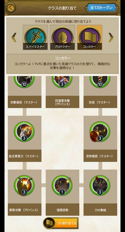 42アップデートで英雄の画面の右上に追加された++のマーク。ここに英雄のクラスが割り当てられる仕組みが搭載された。経験レベル30、60でオープンされるほかパーソナルストーリーのクリアで3つ目が使えるようになる。3つすべてのを開けると下記のクラスが使えるようになり、現在のスキルに似たクラストークンを割り当てられる。ポイントは宝箱やイベントショップで得られるとのことだ。